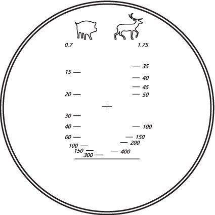 Встроенная в правый окуляр бинокля Yukon Pro 7х50WA (без светофильтров) дальномерная шкала помогает оценить приблизительное расстояние до объекта наблюдения, например, во время охоты или наблюдения за животными в естественных условиях. Отметки на шкале с одной стороны соответствуют холке дикого кабана (0,7 м), с другой – средней высоте оленя по рогам (1,75 м).