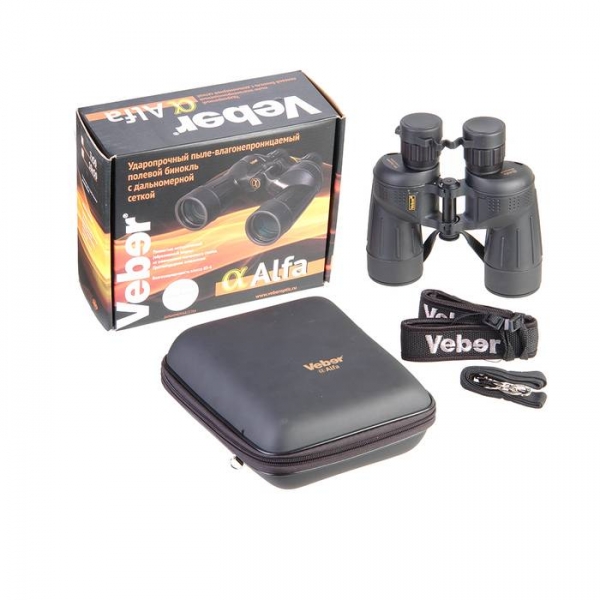 Бинокль Veber Alfa 7x50 WP - современный профессиональный полевой бинокль со встроенной угломерной шкалой и широкоугольной светосильной оптикой. Окуляры бинокля включают асферические элементы, благодаря которым поле зрения бинокля Alfa 7x50 стало больше на 10% по сравнению со стандартным, в нем полностью отсутствуют искажения (кривизна изображения) даже на самом краю поля зрения. Благодаря многослойному просветлению всех оптических элементов наблюдаемая картинка контрастная, резкая и ясная даже в сумерках. Бинокль имеет обрезиненный литой алюмомагниевый корпус, металлические мосты и оправы окуляров. Благодаря новой конструкции блока Porro-призм (выполнены из оптического стекла BAK-4) ,он имеет не только стандартное противоударное исполнение, но он также стоек и к продолжительным вибрационным воздействиям (к примеру возникающим при передвижении по пересеченной местности на автомобиле). Как у любого профессионального бинокля, у Veber Alfa 7x50 WP раздельная фокусировка окуляров, азотонаполнение и класс защиты от воды JIS-6. Как правило, угломерную шкалу можно использовать только при настройке бинокля «на бесконечность», однако при введении диоптрийной поправки, она выходит из резкости. Особенность оптической схемы бинокля Veber Alfa в том, что шкала установлена точно в фокальной плоскости объектива и она остается в резкости при введении диоптрийной поправки.