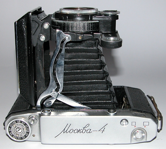 Фотоаппарат Москва-4 – представляет собой советский среднеформатный дальномерный фотоаппарат, выпускавшийся с 1955 по 1958 год Красногорским механическим заводом. Камера имеет складной стальной корпус покрытый дерматином. Объектив камеры выдвигается автоматически после откидывания передней панели с помощью рычажной системы, с корпусом объектив соединяется тканевым мехом. Задняя стенка фотоаппарата открывается на петлях. Автоспуск у данной модели отсутствует, зато имеется синхроконтакт, выдержка – любая. Камера рассчитана на работу с пленкой типа 120 с размером кадра 6×9 или 6×6 см, всего получается 8 кадров. Для работы с размером кадра или 6×6 см в фильмовый канал вставляется специальная рамка, входящая в комплект аппарата. Присутствует также блокировка от двойного экспонирования кадра.