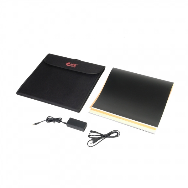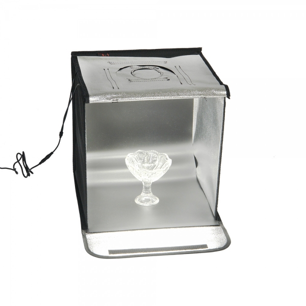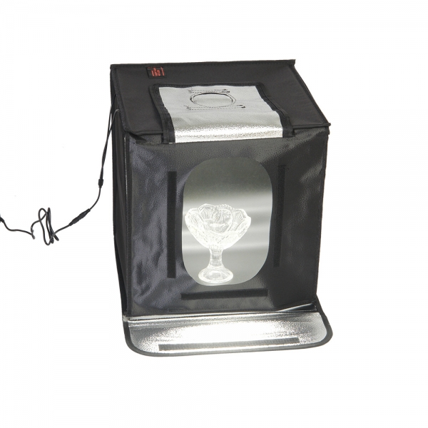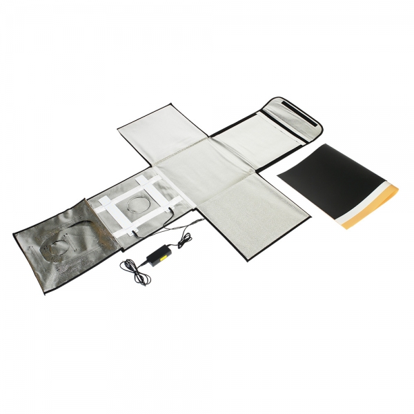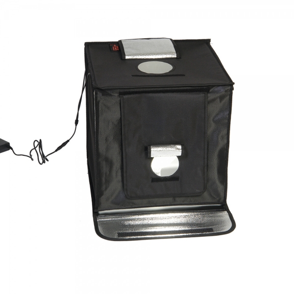 Конструкция разворачивается в квадратный легкий фотобокс и оборудована своим собственным источника света с цветовой температурой 5500К. Внутренние серебристые текстурированные стенки равномерно заполняют куб отраженным светом от двух светодиодных линеек (по 28 светодиодов на каждой). Светодиодные линейки установлены на верхней крышке фотобокса, их можно легко переместить вдоль крышки благодаря системе липких лент (велкро). Монтаж конструкции осуществляется также с помощью липких лент, расположенных по периметру стенок. В сложенном виде занимает мало места, складывается в кейс с ручкой.