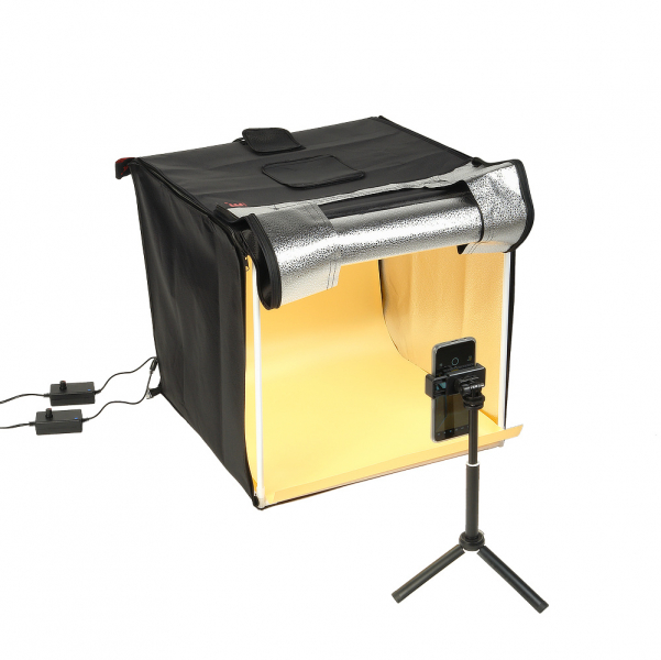 Откидная передняя панель с двумя встроенными окнами Ø11 см и Ø5 см «на липучке» -для съемки с фронтальной стороны, а также верхнее окно Ø7,5 см для различных ракурсов камеры. В комплект входят черный, белый и оранжевый фоны для создания «художественных образов» фотографируемых предметов. Также в комплекте складной мини-штатив 35 см с держателем для смартфона шириной от 5 до 8 см. Компактность фотобокса в сложенном виде и сумка-переноска размером 55х14,5х14,5 см: для удобства работы на выезде. Вес комплекта в сумке всего 2,5 кг.