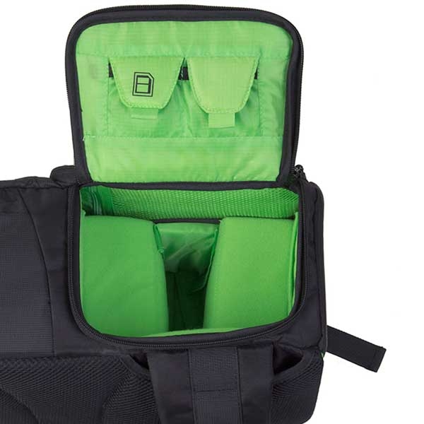 Вместительный рюкзак слинг предназначен для транспортировки и хранения зеркальной камеры, 2–3 объективов, вспышки и аксессуаров. Изготовлен из устойчивого к климатическим воздействиям нейлона с защитным вспененным наполнителем, внутренние стенки из мягкого вельвета яркого зеленого цвета, на фоне которого не затеряются даже самые мелкие предметы. Конструкция слинга и двухзамковые молнии позволяют получить быстрый доступ к фото или видео камере, дополнительному оборудованию. Можно легко перекинуть рюкзак из-за спины на живот и откинув от себя боковую крышку, безопасно и удобно открывать нижний отсек рюкзака, а также использовать это положение как упор под локоть при съемке. Широкая лямка распределяет нагрузку на плече и обеспечивает комфортную эксплуатацию.