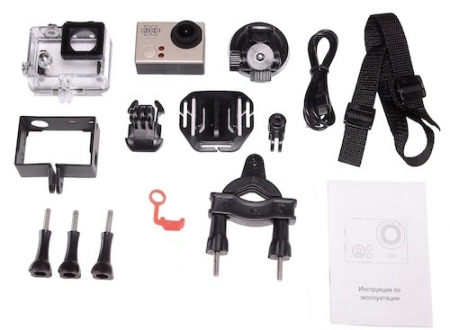 • Кроме камеры в комплект поставки входят крепления различных типов, зарядный кабель и другие аксессуары. Крепления универсальны и могут быть использованы совместно с камерами GoPro;