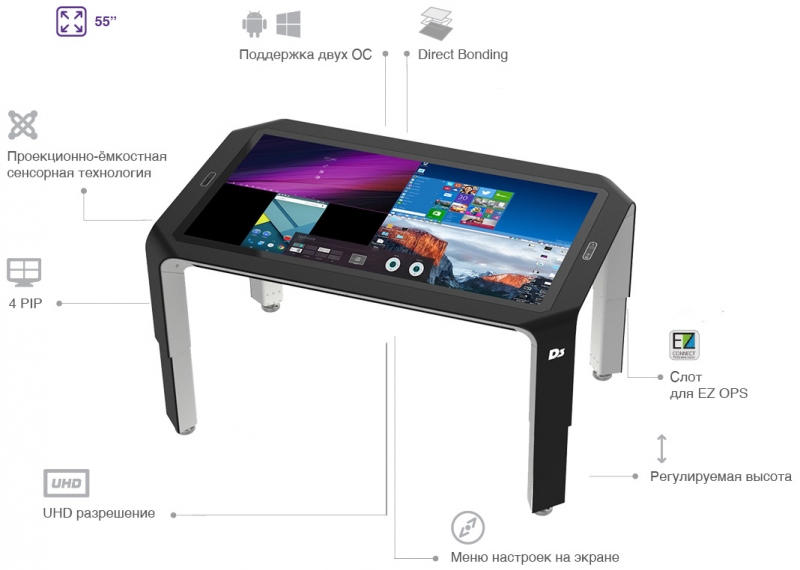 Серия T – это не имеющие аналогов интерактивные столы. Они отличаются полностью регулируемыми по высоте ножками, технологией распознавания касаний PCAP и поддержкой одновременно Windows и Android. Сборка этих столов произведена по технологии оптического склеивания (Direct Bonding), которая придает им изящный лаконичный вид и дополнительную прочность. Интерактивные столы серии Т используются в широком спектре направлений — от ресторанов, банков и офисов компаний до школ и музеев. Серия T — универсальный инструмент, который позволяет легко взаимодействовать со своей аудиторией и доносить ваше послание рынку. Используйте функцию 4PIP (“Картинка-в-картинке”) для демонстрации контента из четырех отдельных источников в режиме реального времени. Интерактивные столы являются водонепроницаемыми и защищенными от царапин, что позволяет использовать их в различных сферах: для совместной работы, игр или преподавания.