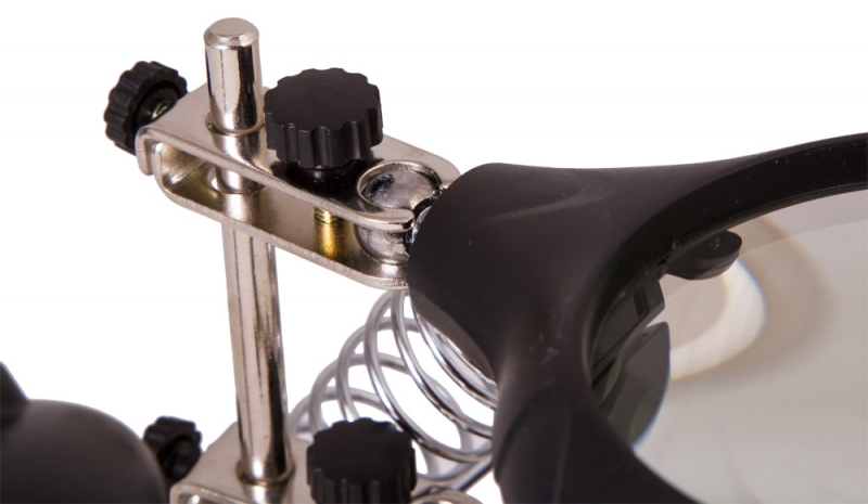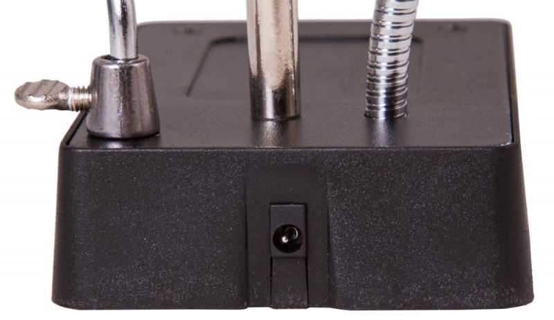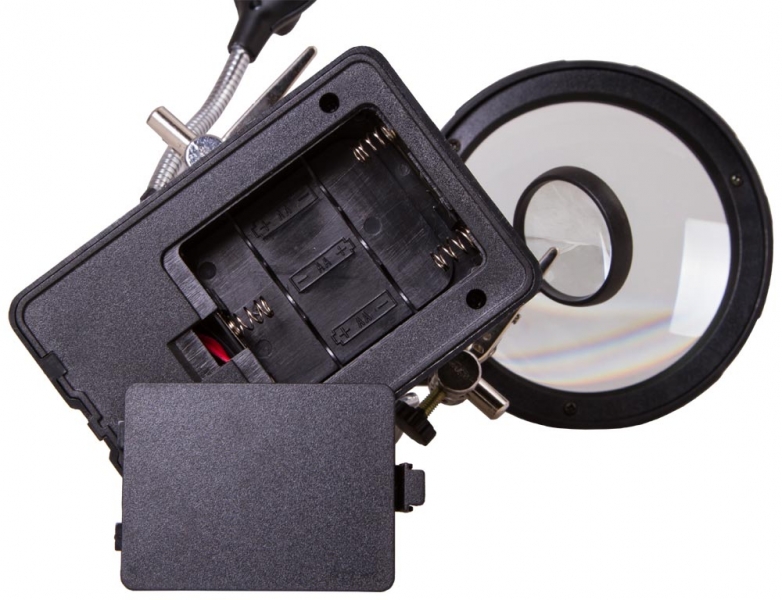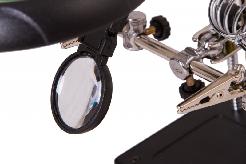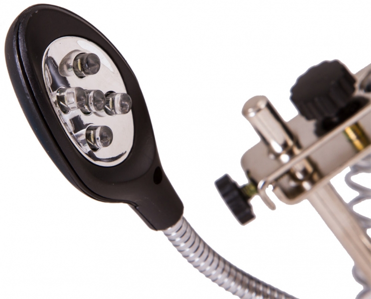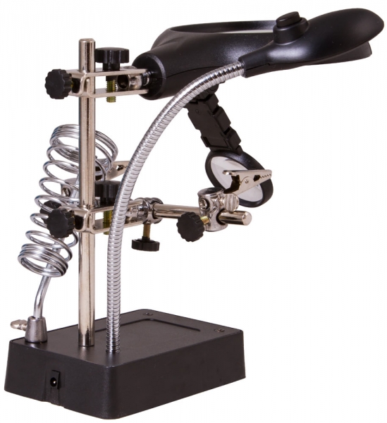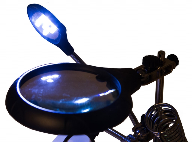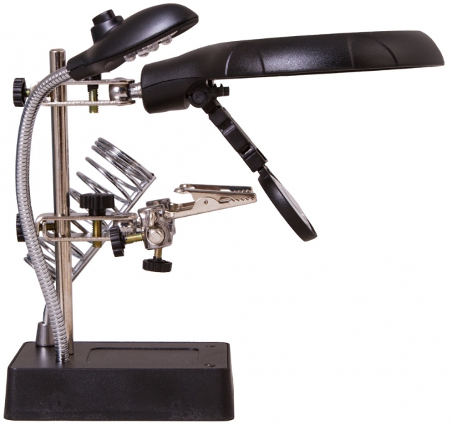 Настольная лупа Levenhuk Zeno Desk D11 – отличный выбор для проведения точных работ. Она станет незаменимым оптическим инструментом для ювелира, часового мастера, моделиста, электротехника или инженера. Лупа позволяет изменять высоту линз над рабочей областью и фиксировать предметы при помощи держателей «третья рука». Есть в ней и встроенная подсветка. Две линзы из оптического пластика расположены друг под другом. Их можно использовать вместе или по отдельности. Рядом на гибком штативе закреплена подсветка. Она состоит из 5 ярких светодиодов и равномерно освещает рабочую область. Для ее питания необходимы батарейки или подключение к сети переменного тока. Под линзами вы найдете специальные держатели для небольших деталей – их называют «третья рука». Они предназначены для длительной работы с платами и масштабными моделями. Рядом расположен и держатель для паяльника. Все держатели съемные.