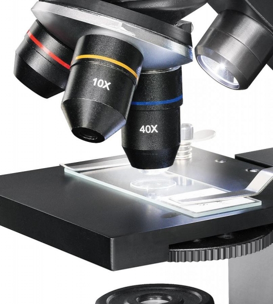 Микроскоп снабжен револьверным устройством на три объектива. Два окуляра 10х и 16х дополнены двукратной линзой Барлоу. Максимальное увеличение при использовании всех оптических аксессуаров составляет 1280х. Настройка на фокус осуществляется широкой рукояткой. Вручную регулируется и положение предметного столика над препаратом. Под столиком находится диск с цветными светофильтрами. Им удобно пользоваться при изучении ярких и прозрачных объектов – детали становятся четче. В зависимости от размера исследуемого образца имеет смысл менять линзы системы освещения. Делается это просто по прилагаемой инструкции.