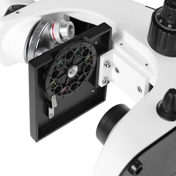 - Штатив микроскопа с наклонным окулярным тубусом, встроенными осветителями отраженного и проходящего света с регулировкой яркости (светодиоды), трехгнездным револьвером и встроенным блоком питания - 1