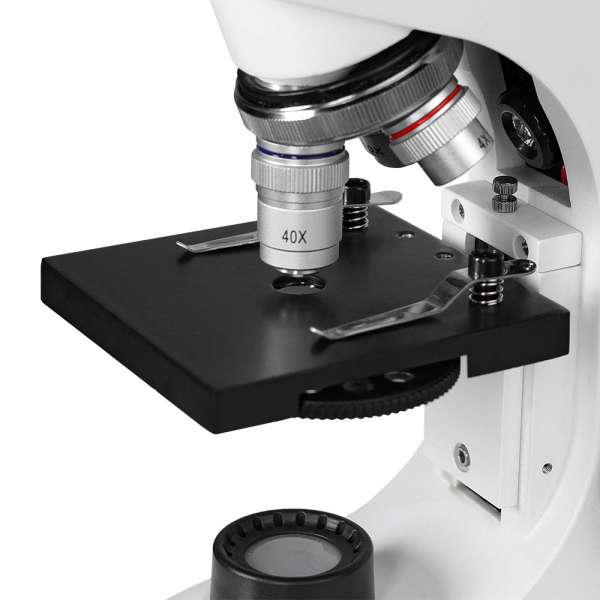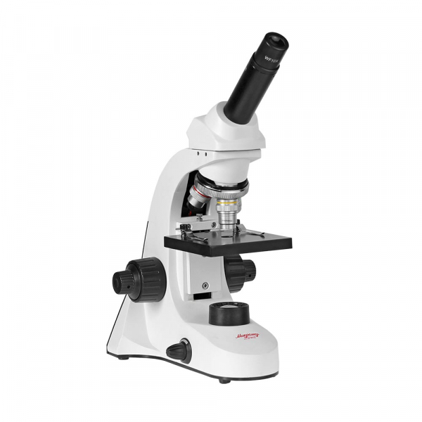 - Рукоятки грубой и тонкой фокусировки, расположенные по обеим сторонам штатива, обеспечивают точную настройку резкости изображения на большом увеличении. Рукоятки расположены на одной оси. Такая комфортная система фокусировки отличает этот микроскоп от других школьных моделей.