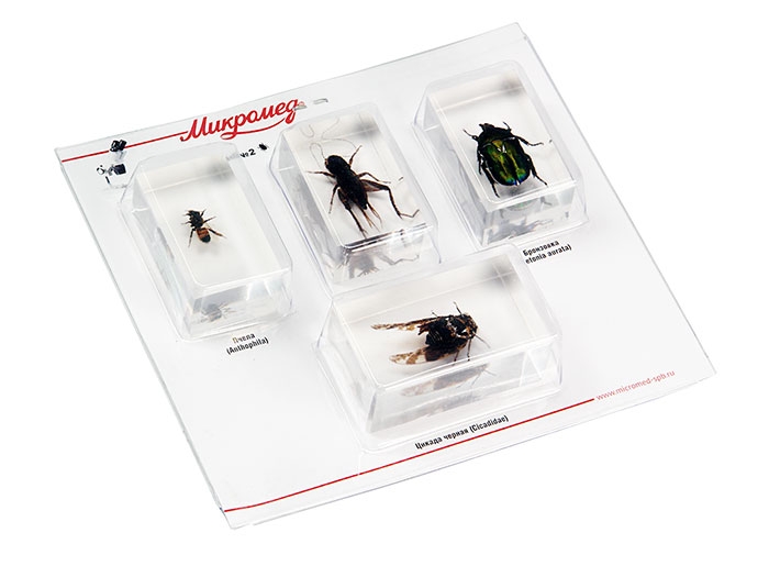Набор готовых образцов насекомых в акриле для проведения исследований на стереоскопическом микроскопе. |