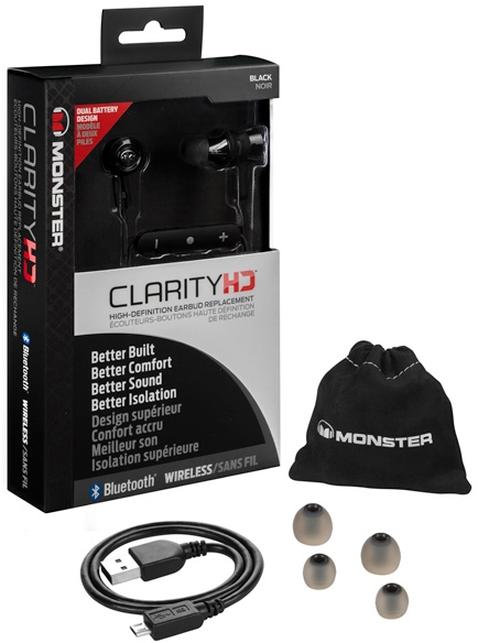 Наушники беспроводные с микрофоном Monster Clarity HD Bluetooth Headphones Monster Clarity HD High Definition In-Ear Bluetooth Headphones (137030-00) - беспроводные наушники с отличной шумоизоляцией от бренда Monster. Беспроводная конструкция идеально подходит для людей, ведущих активный образ жизни, ведь теперь руки свободны и ваши действия ничем не скованы. Данная модель минималистична во многом благодаря наличию миниатюрного Li-Ion аккумулятора в каждом наушнике. Его высокая энергоемкость гарантирует использование наушников без подзарядки до восьми часов подряд. Благодаря легкому весу каждого из наушников гарнитура почти невесома. Дополнительный набор насадок позволит вам подобрать наиболее подходящий размер для максимального комфорта во время прослушивания любимых композиций. Пульт управления с микрофоном, отверстием для зарядки и тремя кнопками расположен на соединительном кабеле наушников. Армированное усиление в точках критических нагрузок обеспечивает прекрасное качество звука без искажений. Особенностью беспроводной гарнитуры Monster Clarity HD High Definition In-Ear Bluetooth Headphones являются выраженные насыщенные басы. Оптимальный диапазон громкости, чистое и качественное звучание, отсутствие шумов и помех также являются несомненными достоинствами данной модели. Лаконичный дизайн наушников обеспечен отсутствием всего лишнего как в техническом, так и в визуальном плане. Модель выполнена в черном цвете, лишена массивных элементов и кричащего декора - ее оценят любители простоты и минимализма. Высококачественный силикон и резина, использованные при изготовлении Monster Clarity HD High Definition не меняют свой цвет и имеют высокую износостойкость.