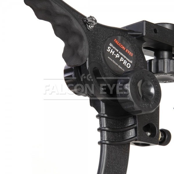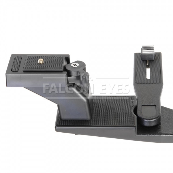 Этот подвижный узел может поворачиваться в пределах 180 градусов, а также передвигаться вдоль по несущей площадке «коромысла» в пределах 25 мм. Выбранное положение фиксируется нижним прижимным винтом. К оси «коромысла» закреплен нижний (подвижный, подпружиненный) изогнутый рычаг — для упора в грудь оператора. Его положение фиксируется любым из двух зажимных винтов — слева и справа от оси. В штативе имеются два посадочных места для установки конструкции на стойку с наконечником 5/8 дюйма (с зажимными винтами и бронзовыми вставками). В комплекте — широкий, мягкий ремень с пластиковым карабином.