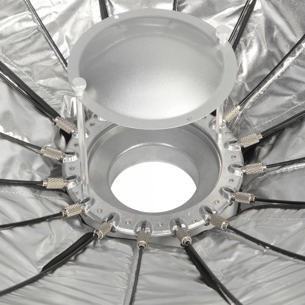 Конструкция тарелки представляет собой основание со специальным механизмом раскладывания спиц и натянутым на каркас тканевым серебристым рефлектором. При раскладывании происходит автоматическая фиксация спицы, а для того чтобы сложить тарелку необходимо лишь отпустить специальный стопор на каждой спице. В комплект входит металлический дефлектор, тканевый внутренний рассеиватель с серебристой вставкой, внешний рассеиватель на липучке и сотовая насадка с ячейками 4х4 см. Тарелка быстро подготавливается к работе, сборка занимает несколько секунд – достаточно просто разложить спицы и установить необходимую насадку. Установленную на приборе тарелку можно поворачивать на 360 градусов, выбранное положение фиксируется винтом на основании с внешней стороны.