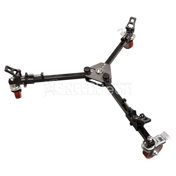 Удобная и крепкая тележка для штативных треног. Можно использовать как при съемках на выезде, так и в студии. Колеса оборудованы тормозной системой. Регулируемая длина зажимов ножек штатива, максимальная нагрузка на три опоры — 80 кг. Упрощает перемещение со штативом внутри помещений и позволяет корректировать движение, придавая ему любое направление. Колеса диаметром 100 мм позволят легко преодолевать такие препятствия как электрические провода от оборудования в студии и