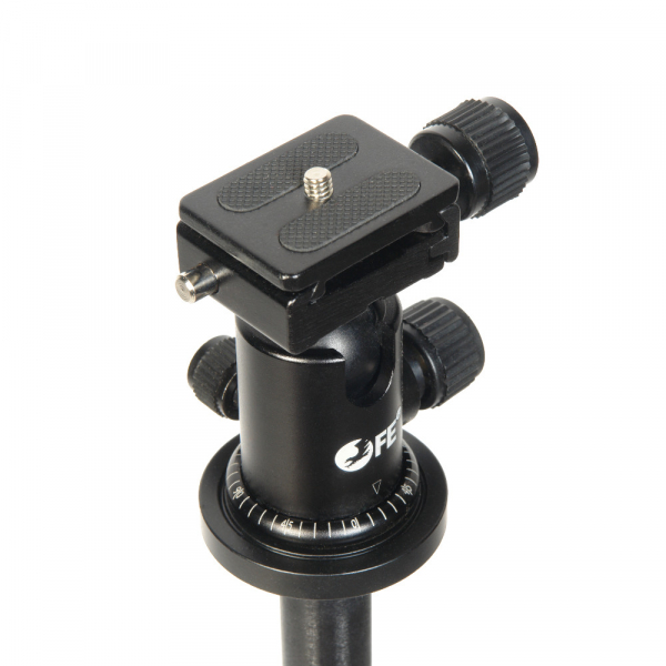 Плавно поворачивать камеру на 360° вокруг своей оси позволяет шаровая штативная голова, установленная на платформу со шкалой для горизонтального панорамирования. Голова сменная, выполнена из алюминиево-магниевого сплава. Регулировочный винт помогает надежно зафиксировать ее в нужном положении. Шаровая конструкция с вертикальным пазом дает возможность изменять наклон площадки с камерой в пределах –90 до +45°. Быстросъемная площадка оборудована винтом 1/4” для установки оборудования и предохранителем от случайного перемещения.