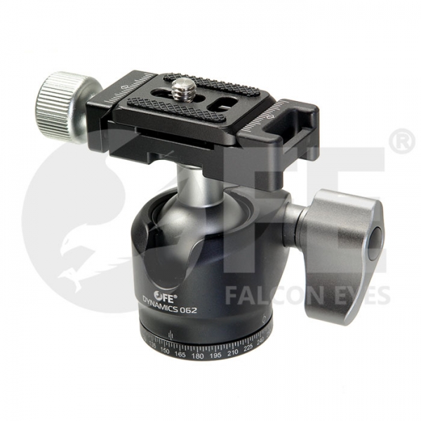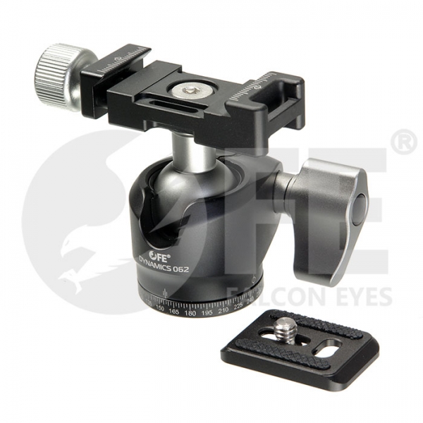 Falcon Eyes Dynamics 062 шаровая штативная голова с быстросъемной площадкой и поворотным основанием для горизонтального панорамирования, предназначена для установки камер весом до 6 кг, диаметр шара 25 мм, размер площадки 25х38 мм.