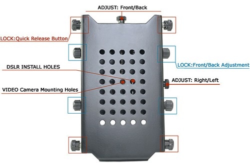 Быстросъемная площадка позволяет быстро установить/демонтировать камеру без использования каких-либо дополнительных инструментов. Площадка оборудована отверстиями для крепежных винтов 1/4" и 3/8", что делает ее совместимой с широким рядом моделей видеокамер. Положение площадки регулируется как по вертикали, так и по горизонтали.