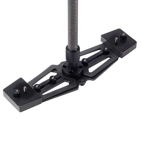 Карбоновая штанга диаметром 20 мм и прочные механизмы сделают работу с этим стабилизатором надежной и удобной. Раздвигающаяся нижняя база стабилизатора с 16 грузами-противовесами, общим весом 780 гр., позволит настроить динамическое равновесие. В основании ручки предусмотрено отверстие диаметром 13 мм, это позволит установить стабилизатор на стойку для настройки баланса системы, использовать «жилет оператора» или упор для запястья.