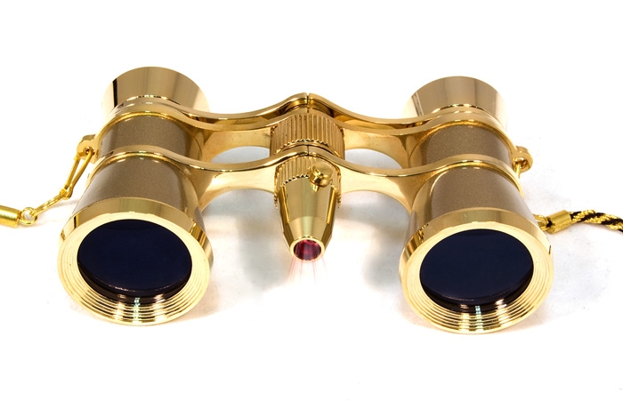 Этот бинокль – сияние золота в ваших руках. Металлический корпус полностью окрашен золотистой краской и удачно дополнен черно-золотой цепочкой для переноски бинокля. Кроме изысканного внешнего вида он отличается и хорошими оптическими характеристиками – большое поле зрения позволяет не упустить из виду происходящие на сцене события, а стеклянная просветленная оптика обеспечивает отличное качество изображения. Удобный механизм центральной фокусировки позволяет настраивать резкость изображения в обоих окулярах одновременно, а межзрачковое расстояние регулируется в широких пределах. Бинокль имеет встроенную светодиодную подсветку – узкий и яркий луч может быть полезен в темном зрительном зале, при этом он не помешает вашим соседям, и не будет отвлекать их от спектакля.