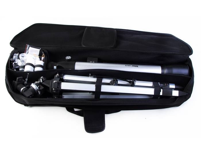 Телескоп поставляется с алюминиевым штативом с возможностью регулировки высоты. Распорки для ножек служат не только для повышения устойчивости, но и в качестве подставки под полочку для аксессуаров (идет в комплекте). Сумка для переноски, в которую укладывается весь комплект, позволяет безопасно (для оптики и внешнего вида) транспортировать прибор для выездов на природу или при походах в гости.