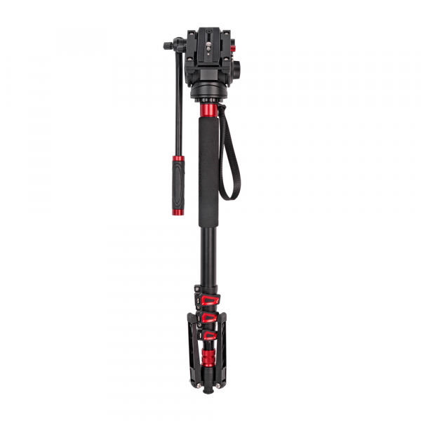 Диаметр секций — 33 / 29 / 26 / 22 мм. При ослаблении клипсового фиксатора — возможна регулировка усилия зажима гайкой под шестигранный ключ (идёт в комплекте). На верхней секции предусмотрены: накладка-рукав из вспененного материала для комфортного удержания монопода в холодное время года и кистевой ремень. На круглой площадка верхней базы монопода находится (реверсивный) винт 1/4″ — 3/8″, на который крепится видеоголовка, а при необходимости непосредственно камера. Для выставления камеры по горизонту, в основании головки имеется пузырьковый уровень.