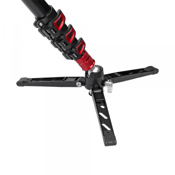 Откидные ножки монопода могут принимать три положения: 1) ножки сложены 2) ножки разложены в максимально широкое положение для максимальной устойчивости 3) ножки разложены в максимально «высокое» положение. Максимально высокое положение ножек может пригодиться в тех случаях, когда для съёмки с разложенным моноподом не хватает буквально ещё нескольких сантиметров высоты; опору( в этом положении ножек) можно использовать и как настольный штатив с несъёмной шаровой головкой. Откидные ножки монопода изготовлены из цельного куска алюминиевого сплава и снабжены фиксаторами и резиновыми накладками. На нижней части шарнира предусмотрена пятка со съёмным резиновым наконечником, которые служат опорой при использовании монопода со сложенными ножками.
