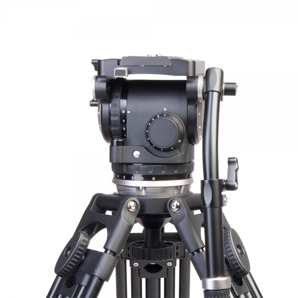 Рукоятка панорамирования обеспечивает высокую точность ведения камеры и может быть установлена слева или справа от головки. Рукоятка крепится к головке через зубчатое соединение, что полностью исключает люфт и прокручивание. Длина рукоятки регулируется в пределах 390-580 мм.
